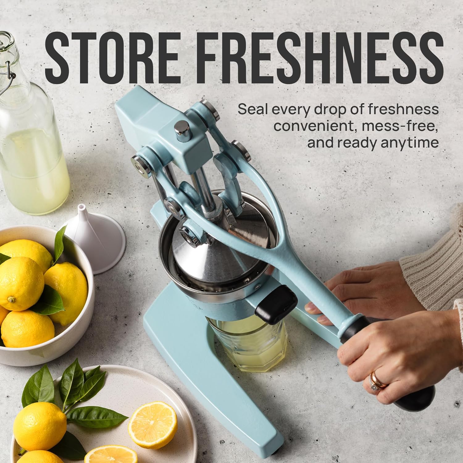 SAVE TIME AND EFFORT: Our citrus juicer makes juicing easy-peasy lemon squeezy. The comfortable grip handle allows you to squeeze all the juice from lemons, limes, or oranges in seconds for making delicious recipes like guacamole, lemonade, cocktails, and more. Unlike bulky electric juicers, you no longer have to worry about electricity or replacing batteries with this manual citrus press.